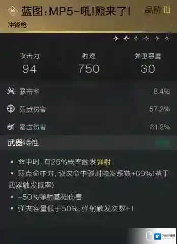 进阶武器的话,小七最想推荐的就是MP5-吼!熊来了!。弹射特性在对付扎堆敌人时收益最大,对准血最多的那个疯狂输出就完事了!但这不代表它只适合对付群怪,MP5自带的高射速和稳定性让它能够对准怪物的弱点快速倾泻伤害。