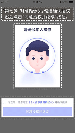 7、对准摄像头,勾选确认授权然后点击“同意授权并继续”按钮进行人脸识别。