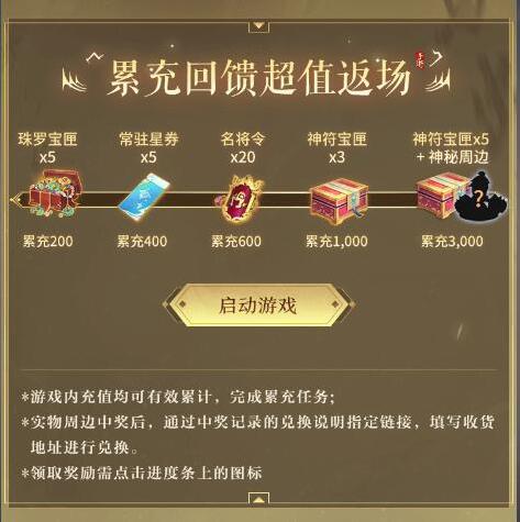 累充回馈到,惊喜探不停!活动期间达到一定充值数额,即可在活动界面领取相应的奖励!充值可以获得珠罗宝匣、常驻星卷、名将令、神符宝匣等丰厚奖励,累充达到3000元不仅可以获得神符宝匣x5,还有神秘周边!