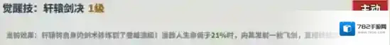 描述:轩辕将自身的剑术修炼到了登峰造极!当敌人生命低于21%时,向其发射一枚飞剑,直接终结这名敌人!