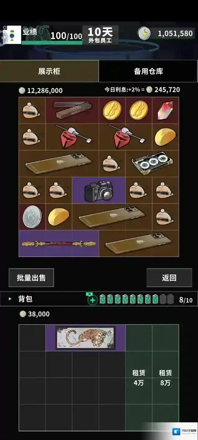 他们最大的的区别就是,放在展示柜的物品有利息,仓库仅有储存功能,而且游戏结算时,你的展示柜会被展出(如图一)。