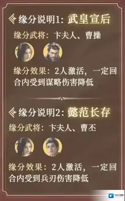 她跟两个武将是有缘分效果的,其一是曹操,2人激活后,受到的谋略伤害会少不少;第二个缘分就是和曹丕,将状态触发,可降低两个人受到的兵刃伤害。