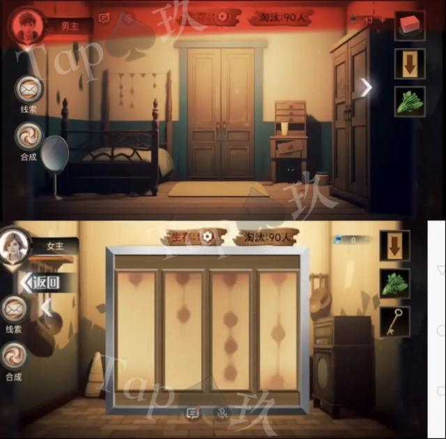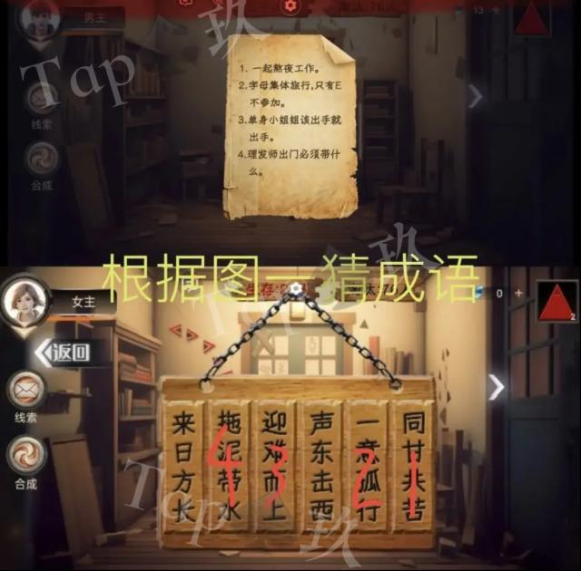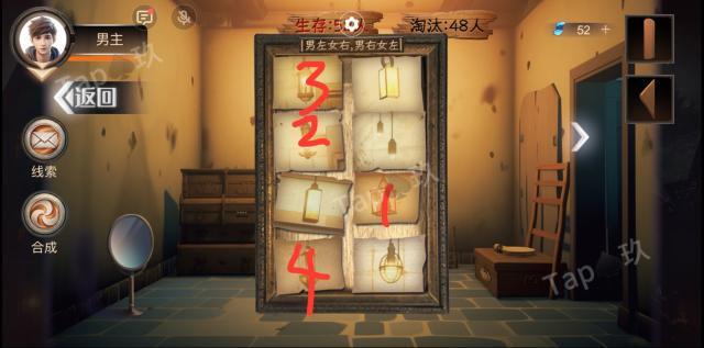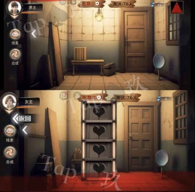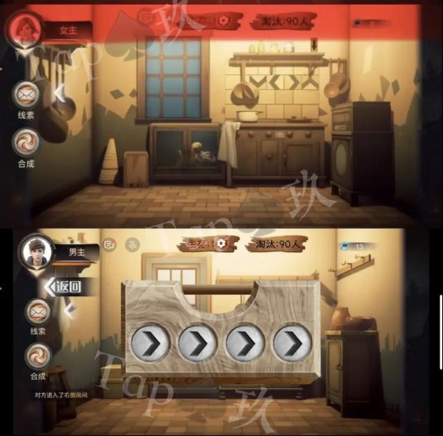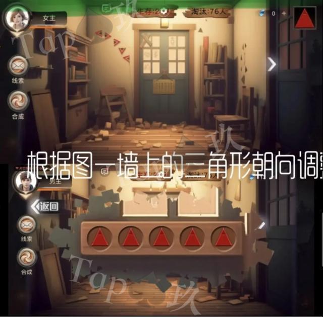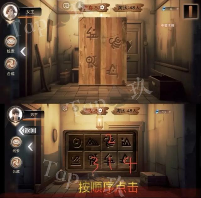 2-地上拾取左大三角木牌传给女主。点击左边屋子箱子显示(男左女右,男右女左),结合男女主视角灯的形状,按数字顺序依次点击,获得左竖木牌,将其放到门上。获得女主左侧房间线索我不知道