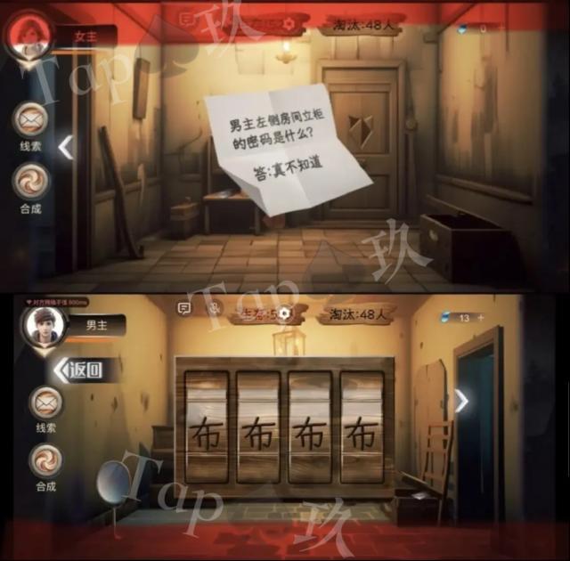 4-根据男主提供的密码我不知道使用谐音梗卧布纸叨打开左侧房间柜子抽屉的机关,获得右大三角牌,放到门上。