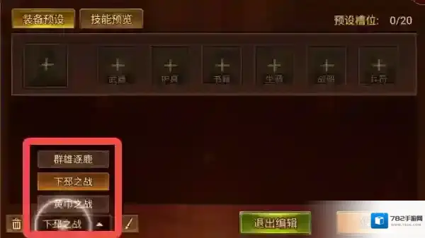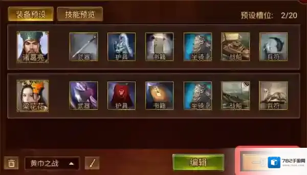 点击右下方武将预设选项后,选择编辑,即可使用已有的道具,为 历史武将 和 自建武将预设多套宝物、坐骑、战船和兵符 搭配。