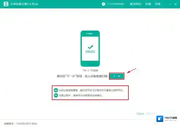步骤二:安装结束后,连接手机到电脑上并运行陌陌恢复大师。软件会对手机进行扫描,等到扫描结束后,点击“下一步”进入下个界面。