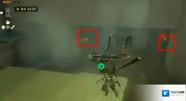 爬梯子来到最上层后蹲下穿过墙上的洞。