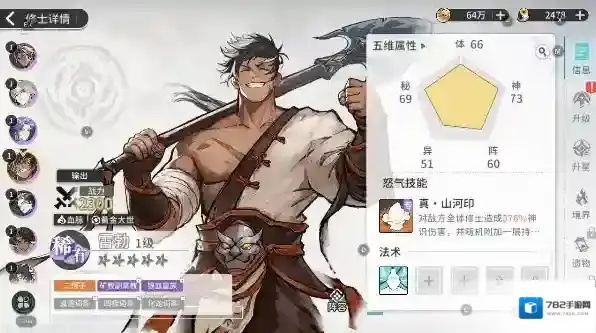 雷勃:对敌方全体修士造成576%神识伤害,并随机附加一层持续2回合的印记。抱山印记:防御降低5%,最多叠加3次,大日印记:攻击降低5%,最多叠加3次火凰印记:受到伤害提升5%,最多叠加3次,日月印记:基础属性降低5%,最多叠加3次