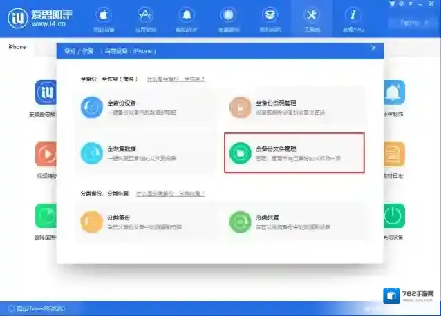1、打开爱思助手“备份恢复”中打开“全备份文件管理”;