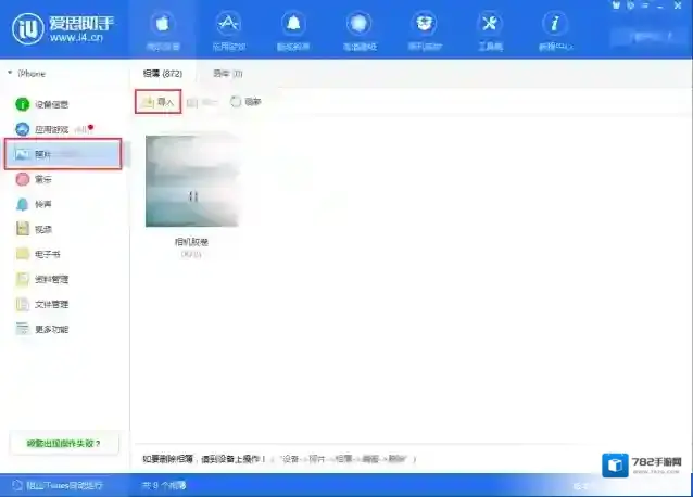 4、然后回到“我的设备”界面点击“照片”,点击上方“导入”按钮,选中刚才导出的照片,然后在设备上打开“爱思助手”移动端,并且允许爱思助手访问您的照片,即可完成导入;