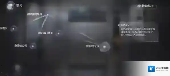 6、进入房间三,收集所有线索,点击思考,获得结论危险的天台。