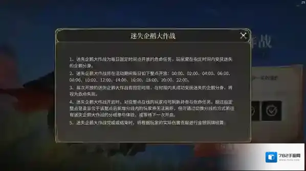 “迷失企鹅大作战”是活动期间的特殊FATE(临危受命任务),完成活动支线任务“神秘来客寻踪之旅”后可以点击查看,前往碧企鹅瀑布与活动NPC对话后可以接取任务并获得100“企鹅币”。首次完成活动FATE能领取成就称号和200“企鹅币”奖励。活动FATE每地球时间偶数整点刷新一次,每次持续30分钟,玩家需要在30分钟内完成任务,否则就会失败。每次完成活动FATE都能获取20“企鹅币”。多多参与活动FATE,兑换奖励吧。