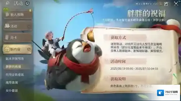 “胖胖的祝福”:活动期间以常规模式参与四人迷宫,讨伐歼灭战,大型任务玩法,通关后开启副本内宝箱有概率掉落道具胖胖企鹅角笛,使用道具即可解锁该坐骑。使用剧情辅助器,解限模式通关副本不会掉落坐骑哦。