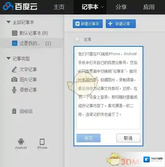 我们只需在PC端或iPhone、Android手机中打开自己的百度云账号,然后从网盘界面中切换到“记事本”,就可以书写内容、拍摄图片、录制语音,最后保存为记事文件即可(图6)。