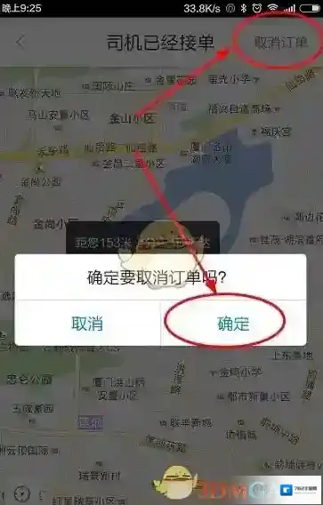 7、当然如果叫到司机了但是你又不想去了,则可以点击取消订单,然后系统会提示你是否确定取消,我们点击确定就可以取消订单了。当然既然你已经下单了要取消订单的时候要好好和司机进行沟通哦。
