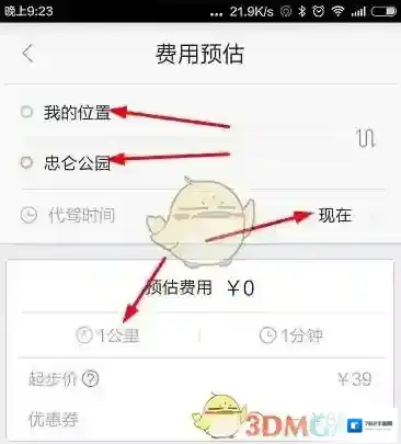 5、我们可以点击费用预估功能,进入到费用预估界面,我们需要输入我们的起始地方以及目的地,然后代驾时间,系统就会自动估算出需要的费用情况。