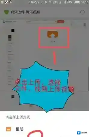 7、点击后,在打开的页面中点击下点击上传选项,就会弹窗选择上传方式。选择文件,选择自己的手机里面视频就可以上传了。