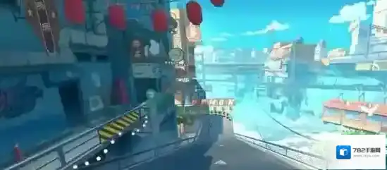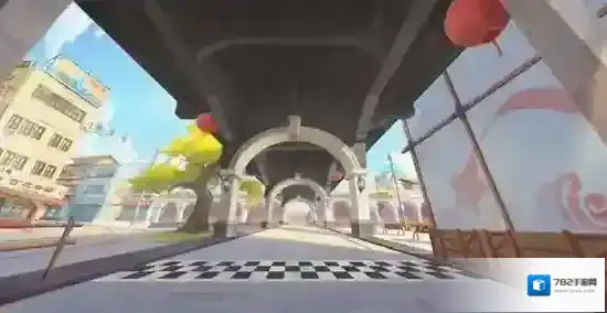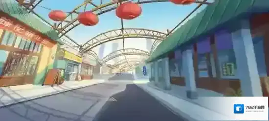 老街工地赛道的整体场景采用老街风格的设计,充分突出了建设过半却戛然而止的废弃街区的寂寥感。赛道的起点设置在一条笔直的长廊,长廊两侧的建筑挺立,颜色鲜艳的牌匾提示着这里不久前还是一片繁华和喧闹的景象。