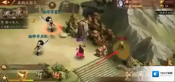 本章隐藏点为线索事件,需要先拿到线索才能触发,线索位于地图上方的山脚下,拾取散落的纸页,根据指示来到地图左下方貂蝉右侧石阶旁的山脉,即可触发隐藏点。