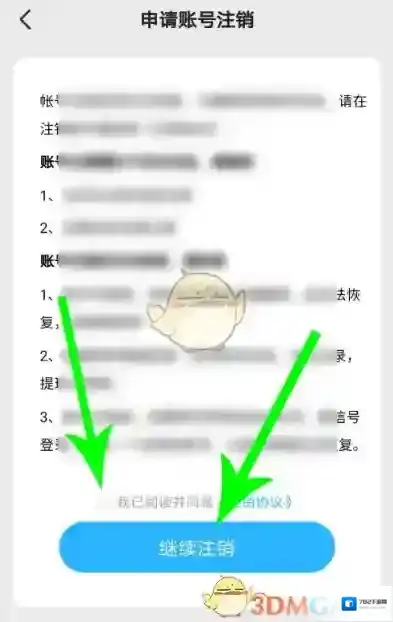 4、打开申请账号注销界面查看注销协议,查看完毕勾选“注销协议”,然后点击“继续注销”,接着根据提示操作注销即可。