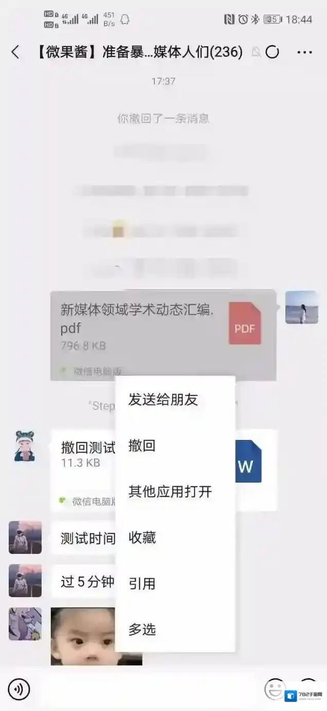 此外,三大妈手游网小编发现,微信文件的撤回时间可以超过2分钟。如图所示,一个小时前发送的文件,超过一个小时仍可以撤回。