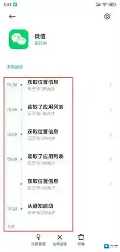 4、点击之后就会进入应用行为记录内,可以看到所有应用进行的权限操作,包括限敏感操作行为(还可以通过设置 – 应用设置 – 应用管理 – 应用行为记录进入查看);