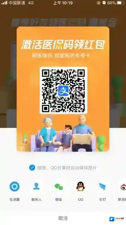 3、保存分享二维码图片到手机后,发送给你的亲朋好友,他们激活支付宝医保码,你就可以获得佣金收入