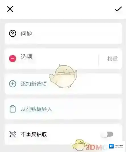 《小决定》自定义设置转盘内容教程 2025-07-10 13:30:15 编辑: 小艾 分类: 应用教程 • 阅读: 192 1、进入小决定APP后,点击右上角的“三横” 2、然后点击右下角的“+” 3、在选择模板界面,点击“创建新决定” 4、在这里就可以创建问题,然后对文字和决定内容进行修改创建了。 小决定应用相关内容 全部 小决定模板 小决定 小决定创建 小决定点击 小决定就可以 《小决定》转盘设置教程 1、打开小决定app后,可以看到主页有一个设置好的转盘,这个可以直接用。 2、如果想自己设置的话,就点击页面右上角“三横”。 3、然后点击右下角的“+”加号,创建一个新的转盘。 4、点击模板可以直接进行修改,点击红色的符号可以删除,点击权重可以设置选... 2025-07-10 发表回复 请登录后评论... 登录后才能评论 评论列表 ( 0条)