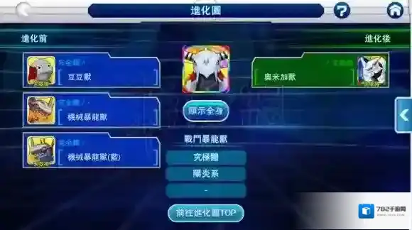 奥米加兽是战斗暴龙兽和钢铁加鲁鲁兽合体进化的,必须有两只究极体的碎片加上奥米加兽的碎片才能获得。
