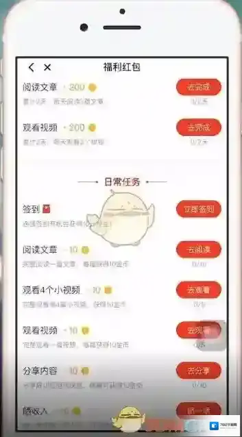 4、如果还没满足,往下滑动还可以在福利红包页面领取任务,完成后就能获得金币,金币也可以兑换成红包哦。