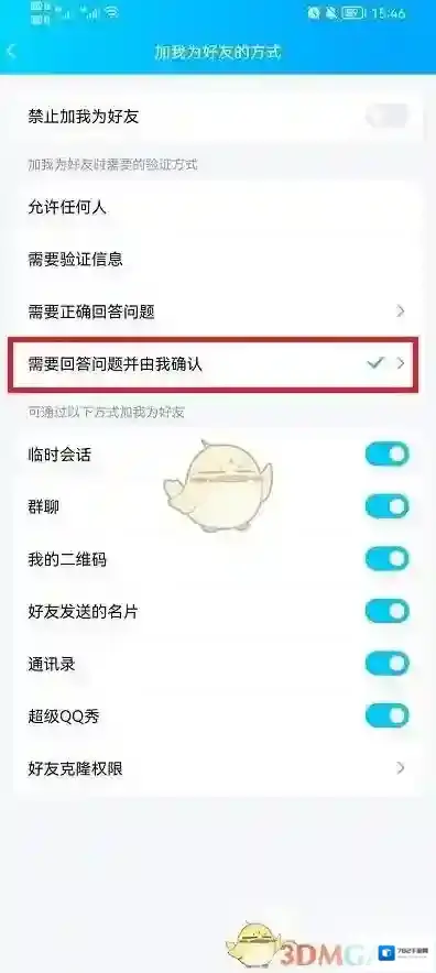 4、在隐私功能界面,就可以看到加我为好友的方式点击打开;