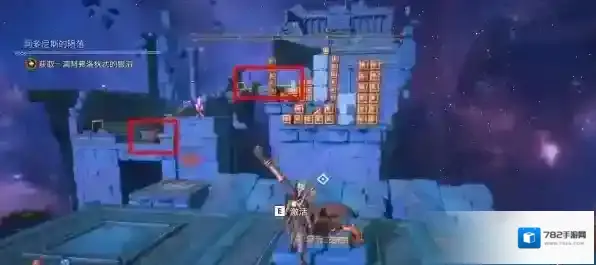 该秘境需要对照着上方墙壁上箱子的摆放,踩亮地面上对应箱子位置的圆形平台即可,注意躲避旁边墙上喷出的火球。
