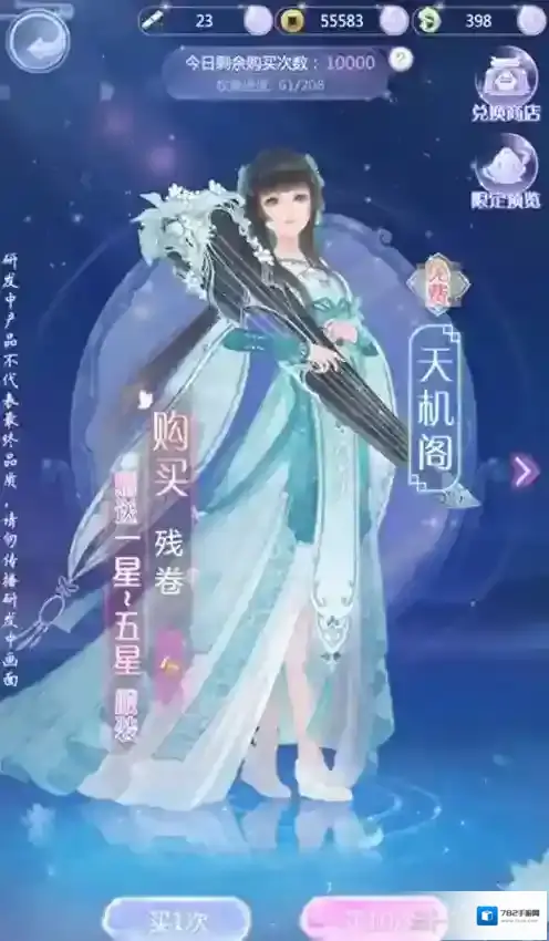 天机阁是金币抽,抽一次要3k金币,给一个衣服部件和一个书卷残卷,10个残卷换一个书卷,书卷用处同上。