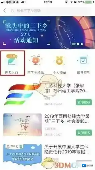 3、指导教师和团队成员点击“活动”-“三下乡专题”-“报名入口”,进入创建和搜索团队页面,点击搜索框根据“团队编号”搜索团队,申请后请等待队长审核。