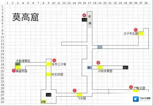 按照下图所示坐标,最省文房四宝临摹路线依次为:(15,27)飞天图→(19,19)沙弥求爱图→(27,9)太子图→(26,26)尸毗王图→(9,18)机关洞(20,25)文殊奴图→卧佛洞(2,15)鹿王本生图→(3,19)珈蓝奴图。临摹完《妙乐奴图》、《珈蓝奴图》、《三圣奴图》、《文殊奴图》4幅图,背包内拼装即可得到《十六天魔舞》,可以领悟天魔舞。