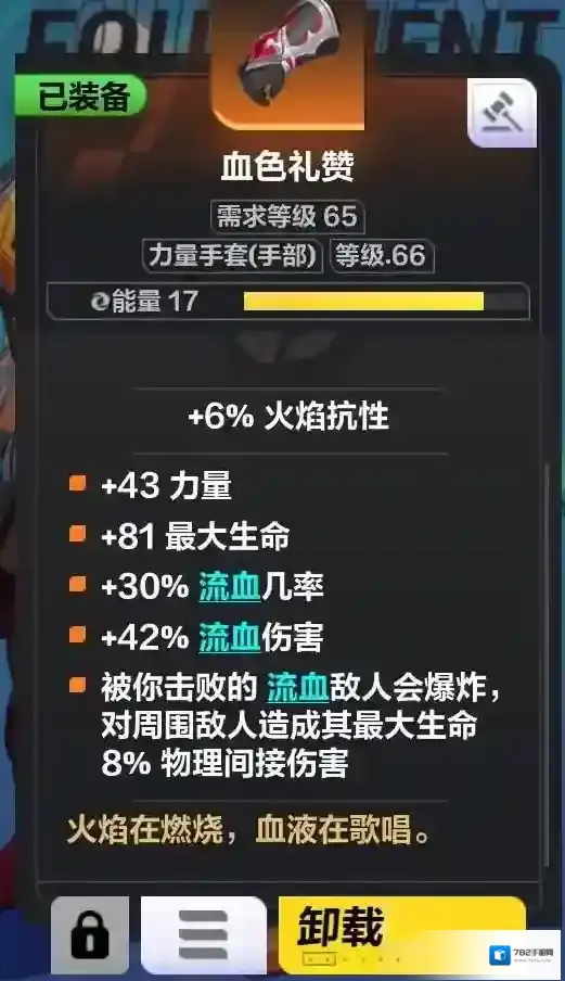 流血爆炸:通过便宜的暗金手套 血色礼赞,击败流血敌人时产生爆炸,高效清图。由于暗影术士的天赋点,击中时必定会造成流血,因此覆盖率极高