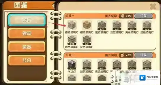 在图鉴里面找到家具一栏,就能找到淡蓝玻璃灯。