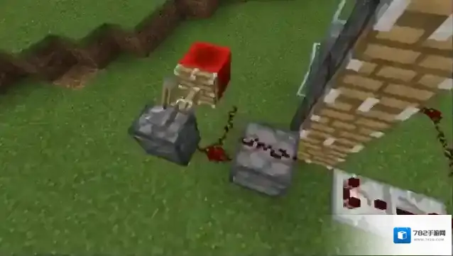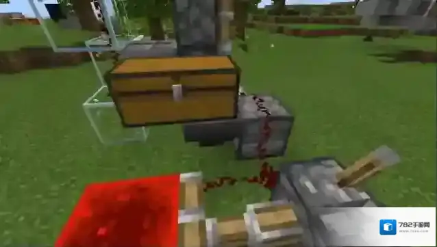 接着在活塞背后放置三份红石粉还有一个粘性活塞和一块红石块,在粘性活塞的上方放置一个拉杆作为开关。
