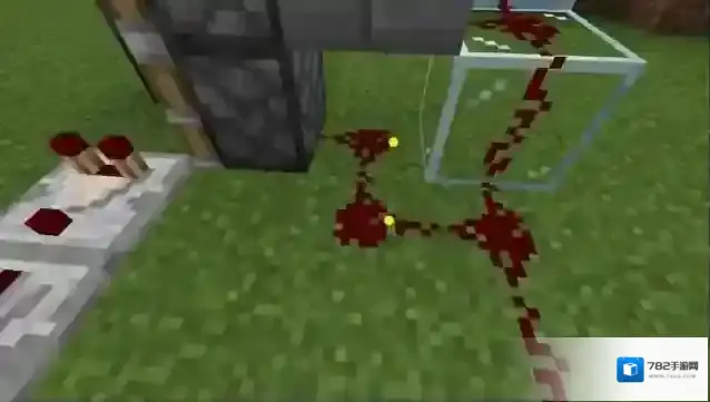 然后放上红石粉制作红石电路,每块玻璃上都放置一份红石粉。