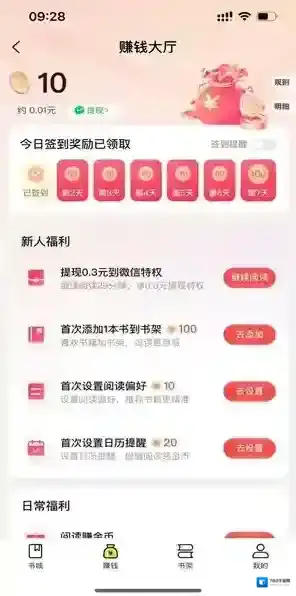 4、最后,我们点击下方赚钱的功能选项,即可进入到赚钱大厅的页面当中了,还可以通过每日签到来领取奖励,小说看的时间越长,获得奖励更多。