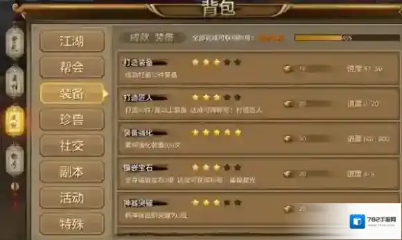 神器铸造,神器突破,暗器修炼,暗器品质,镶嵌宝石,打造装备,打造匠人,装备强化,八个系列。全部完成可以获得称号,铁甲神兵。