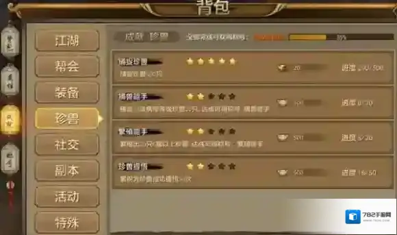 捕捉珍兽,捕兽能手,繁殖能手,珍兽提悟,四个系列。全部完成可以获得称号,四海通灵师。