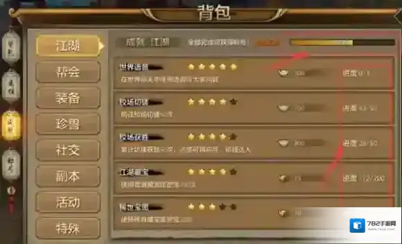 世界语音,校场切磋,校场获胜,江湖仓图,稀世宝图,五个系列。全部完成可以获得称号,誉满江湖。