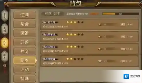 挑战老三环,挑战燕子坞,挑战四绝庄,挑战缥缈峰,四个系列。全部完成可以获得称号,天战行者。