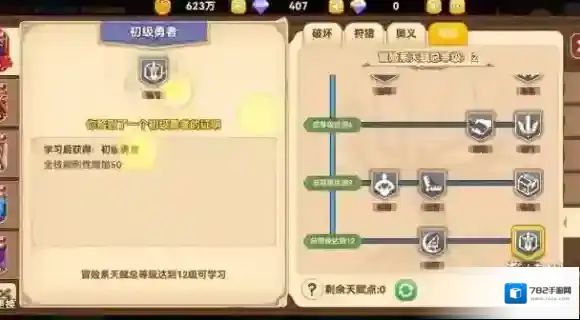 2、其次选择奥义里面的耐穿和冒险里面的初级勇者,提升生存能力和法伤。