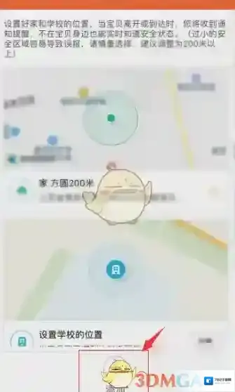4、在该页面,可以设置家和学校的位置,当宝贝离开或到达时,你将会受到通知提醒,不在宝贝身边也可以实时知道孩子的安全状态,这里建议将安全距离调整为200米左右。