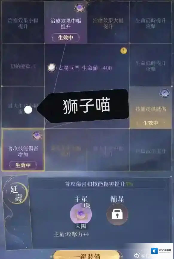 星石的话别人都不重要,就狮子喵和阿蝉最好有太阳+巨门来提升生命,保证不死,尤其是游戏外的阿蝉至少要有8552+的血才能保证地宫内限制40的阿蝉有7200+的血,这样就不会在第8回合的时候被张辽打死。