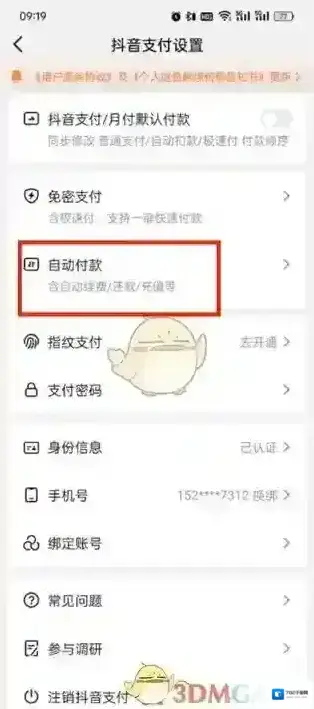 4、之后进入到抖音支付设置的页面中会有不同的功能可以使用,在这里我们需要点击的是自动付款;