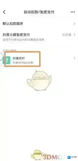 5、在自动付款的页面可以设置默认扣款顺序,还可以看到已签约的服务,我们点击抖音月付;