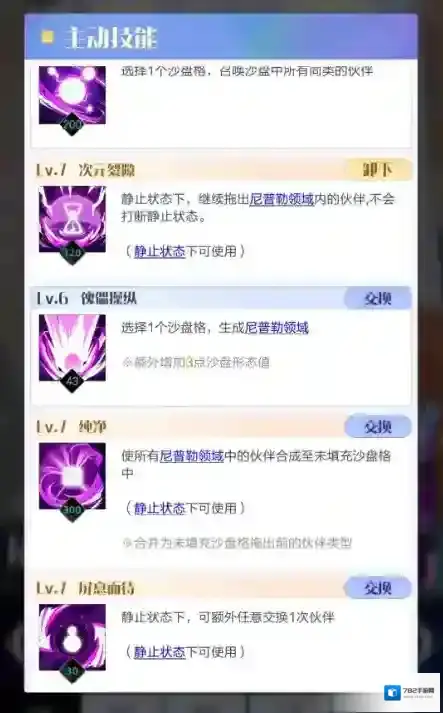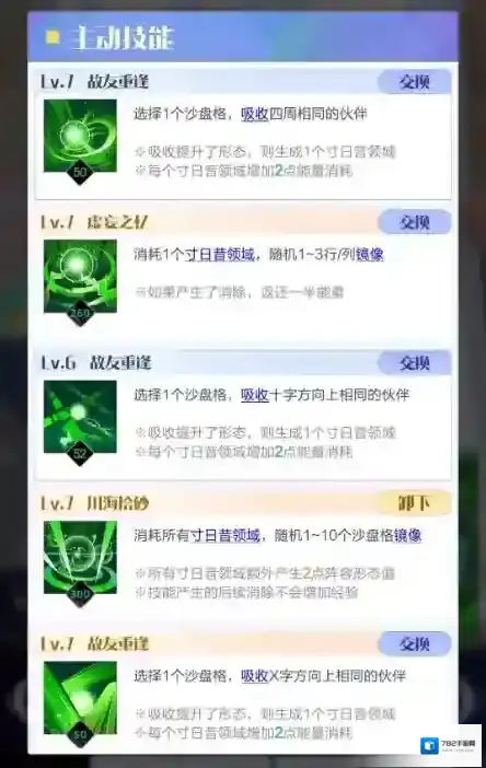 这套技能组旨在使强伙伴的方块通过镜像的方式覆盖大片沙盘,从而合成高级伙伴。三个消除类技能选择手感合适的即可,虚妄之忆用于能量不足的情况进行小规模镜像(如竞技场中每轮稳定爆发),可按个人喜好替换为消耗类技能。